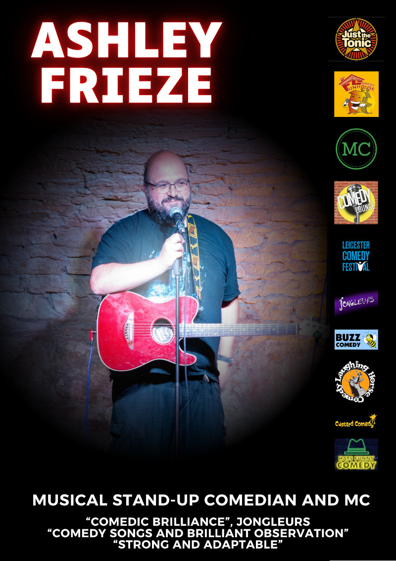 Ashley Frieze has been performing on the UK comedy circuit since 2003. He's a warm, quick-witted MC, and a barnstorming featured act. His particular brand of comic songs, and music-infused stand-up has something for every audience, spanning many genres from Jazz through to Coldplay.
